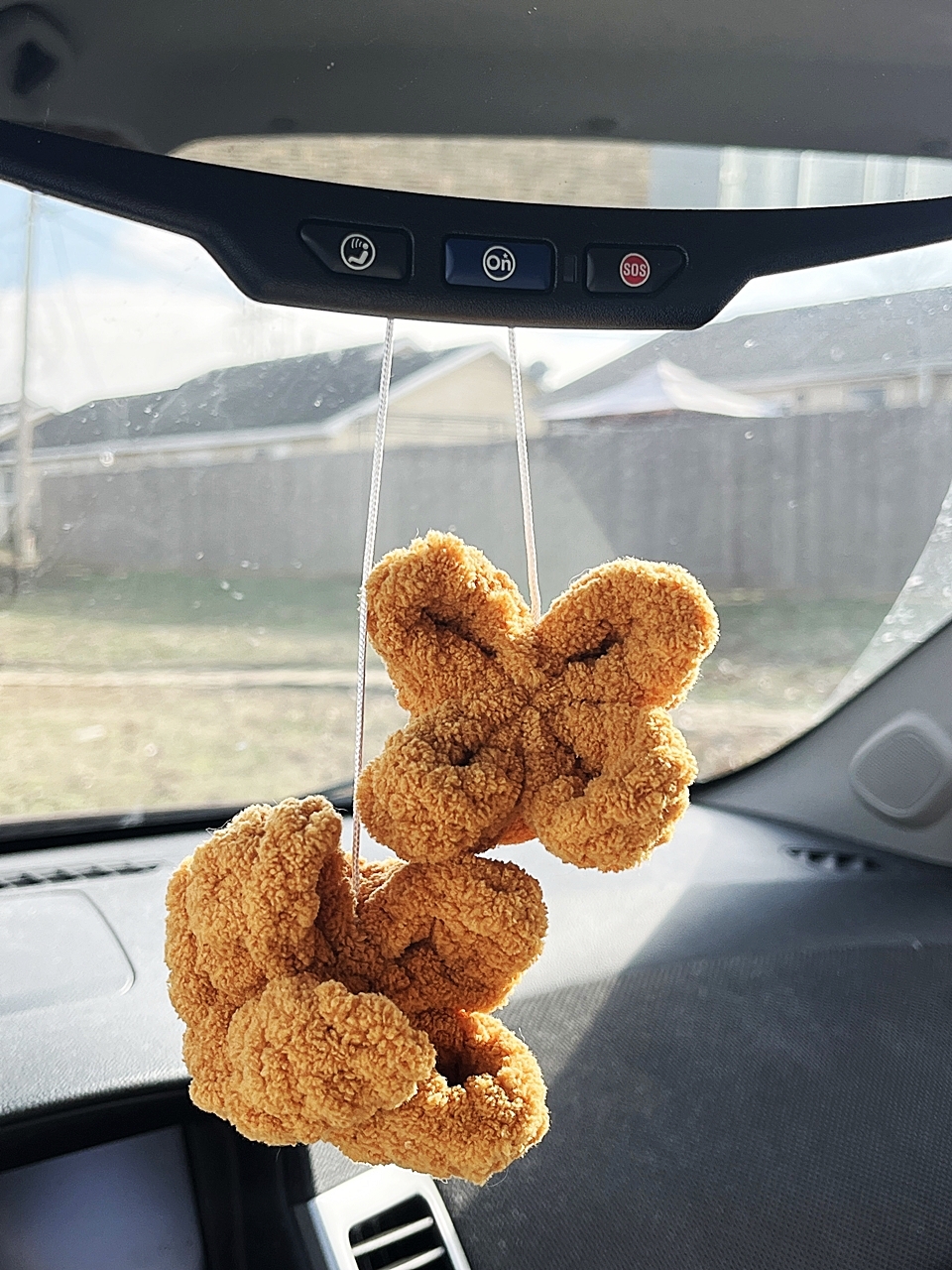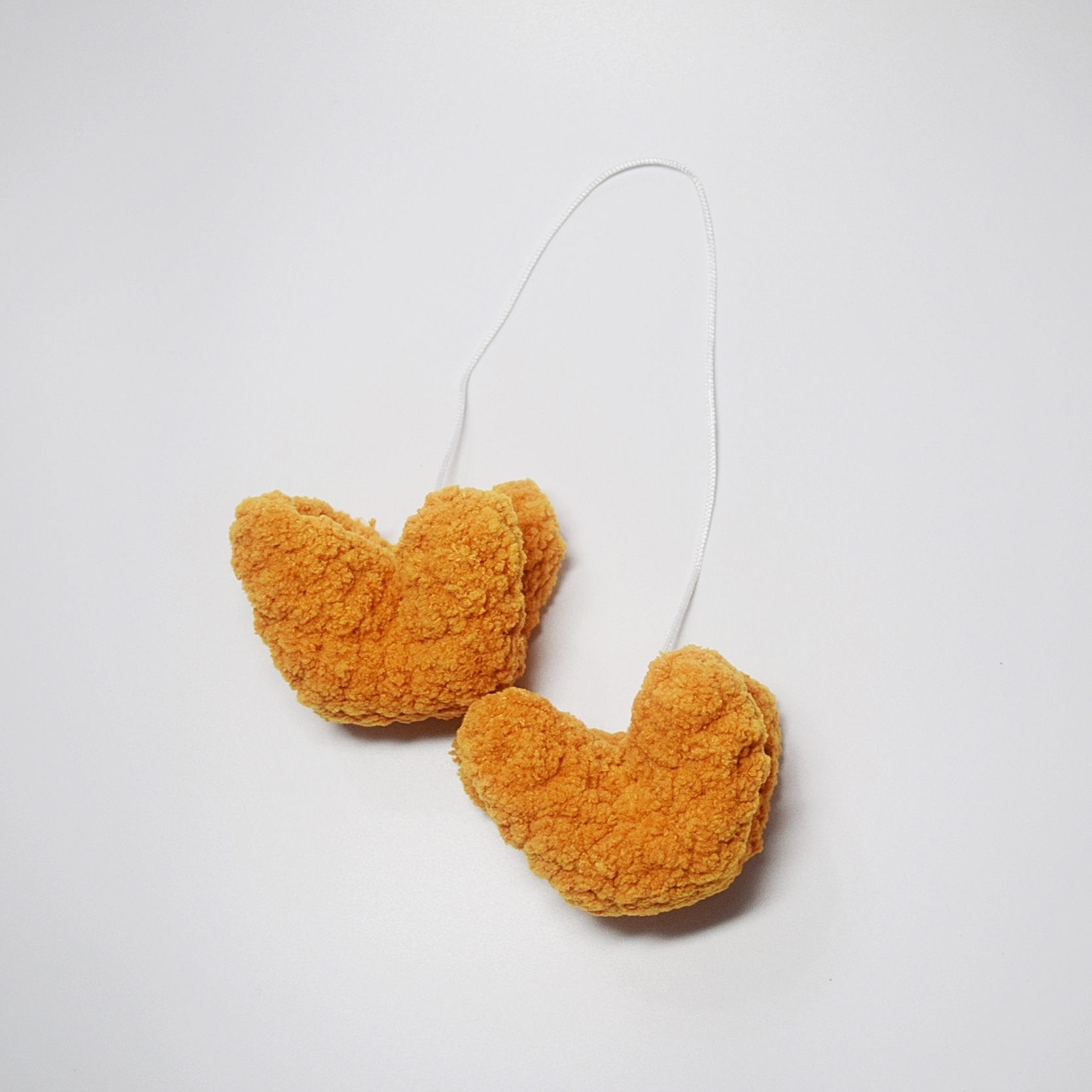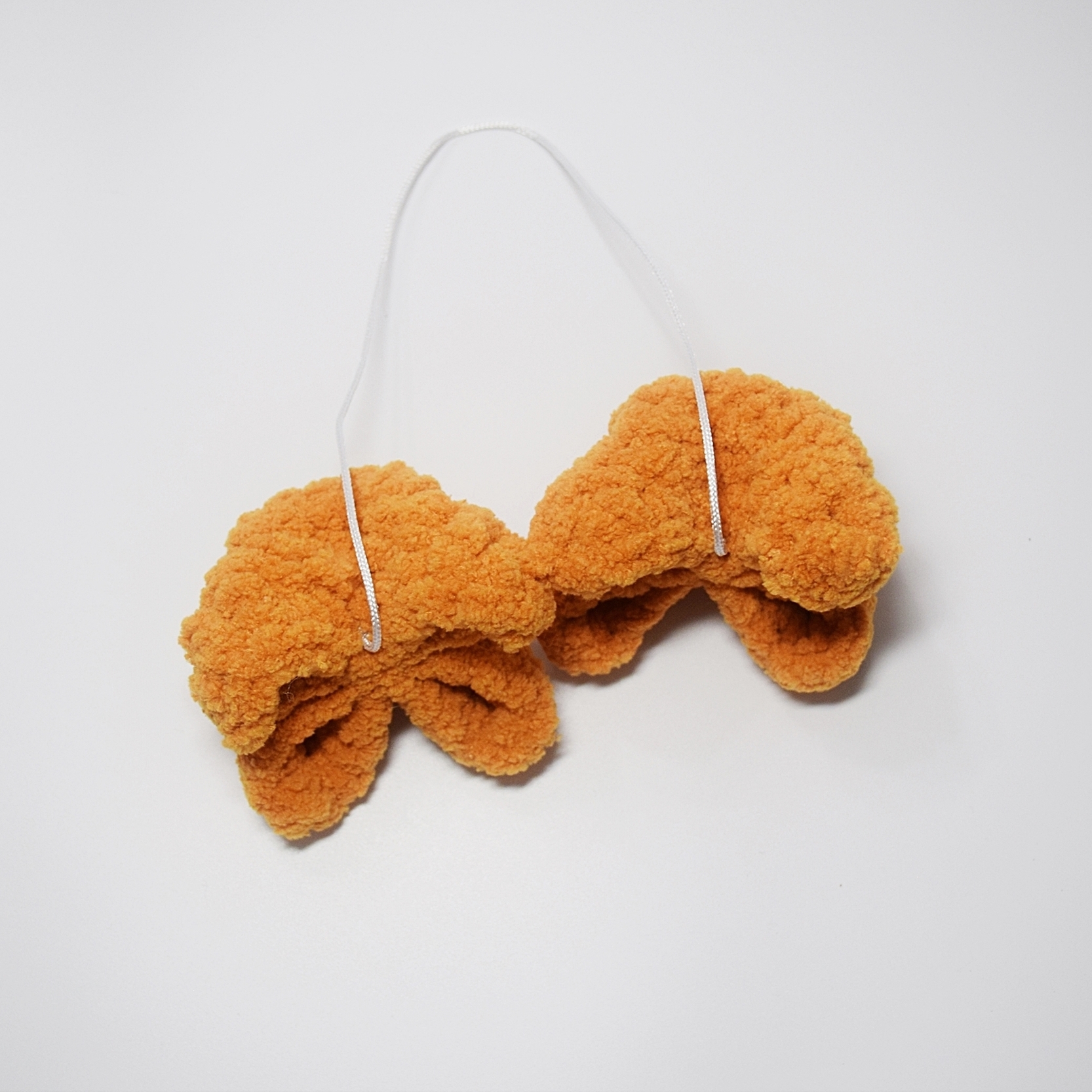 These two fuzzy crab rangoons are hanging from a nylon string making them the perfect rearview mirror accessory for the crab rangoon enthusiast. Each crab rangoon is approximately 3 inches wide and 2 inches tall. String length is 12-13 inches.