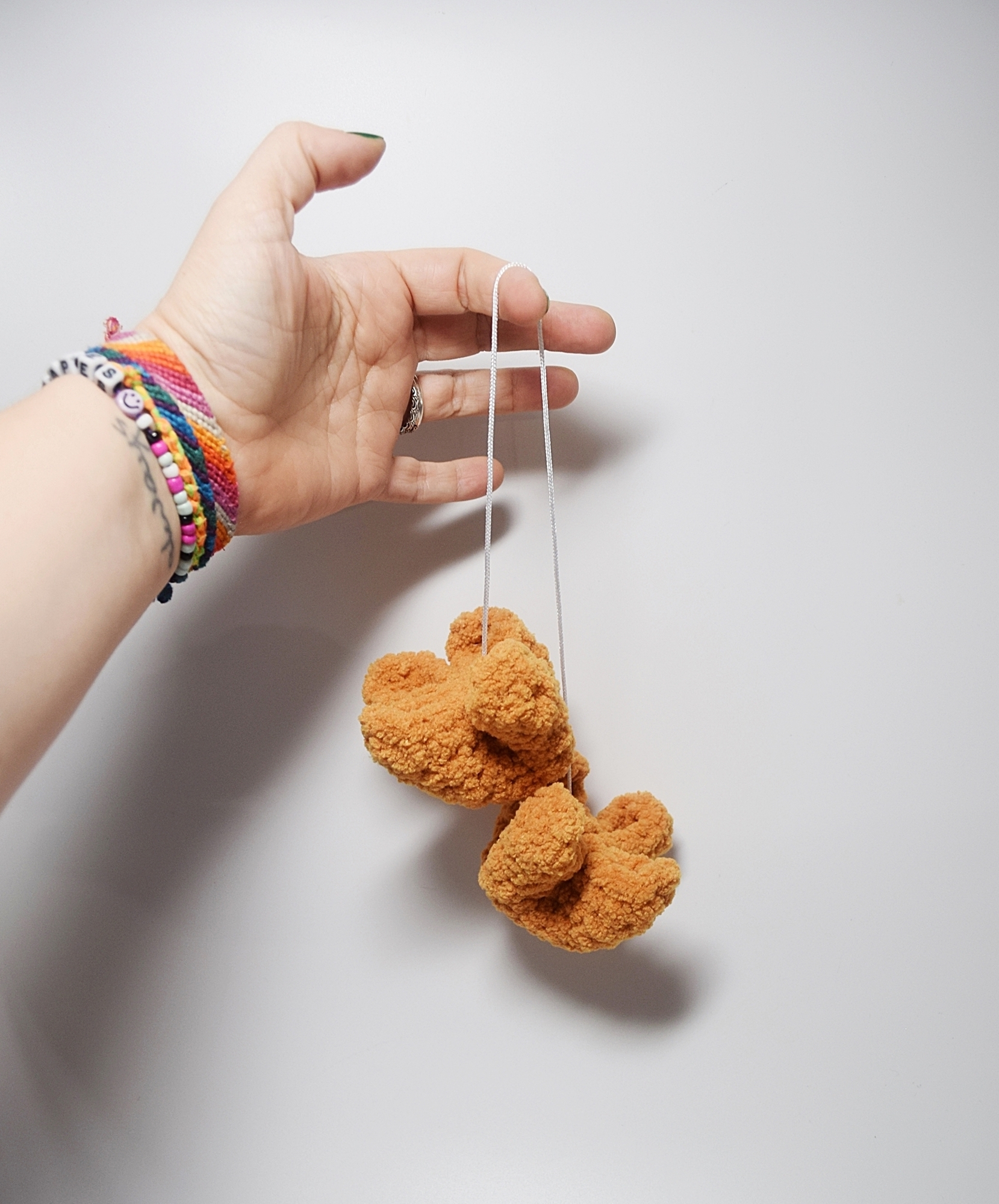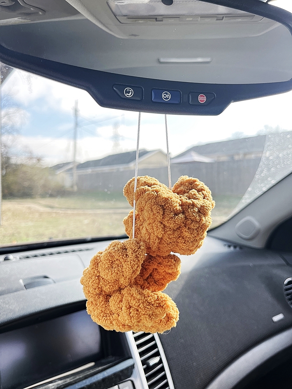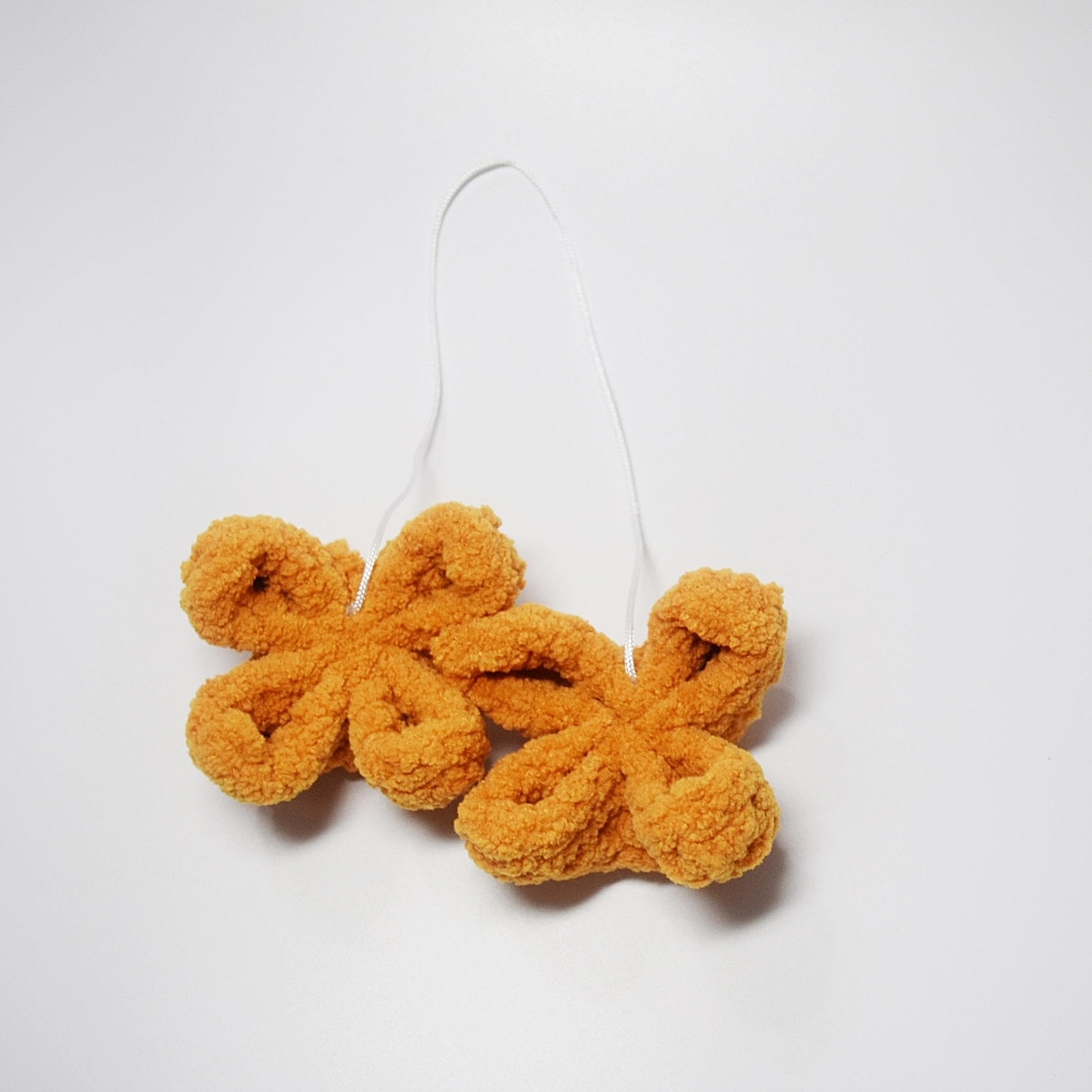 These two fuzzy crab rangoons are hanging from a nylon string making them the perfect rearview mirror accessory for the crab rangoon enthusiast. Each crab rangoon is approximately 3 inches wide and 2 inches tall. String length is 12-13 inches.