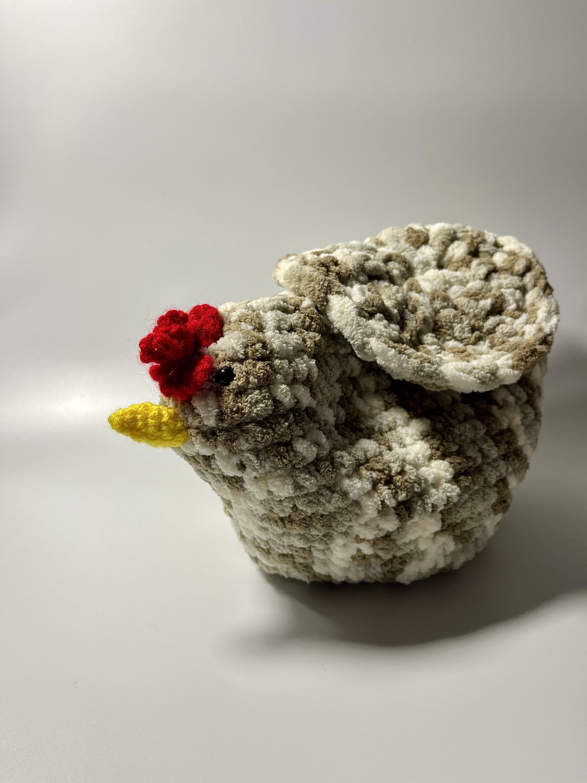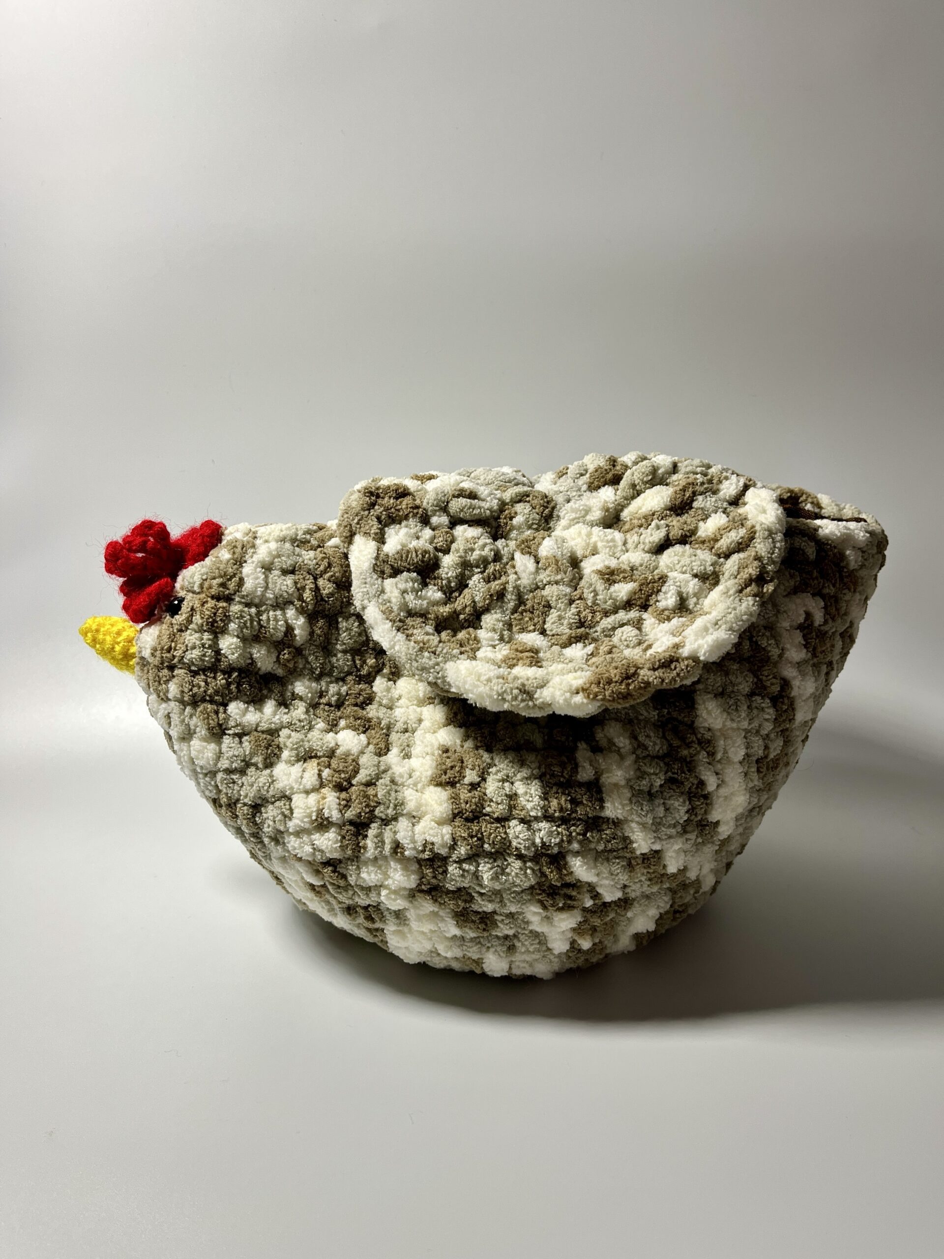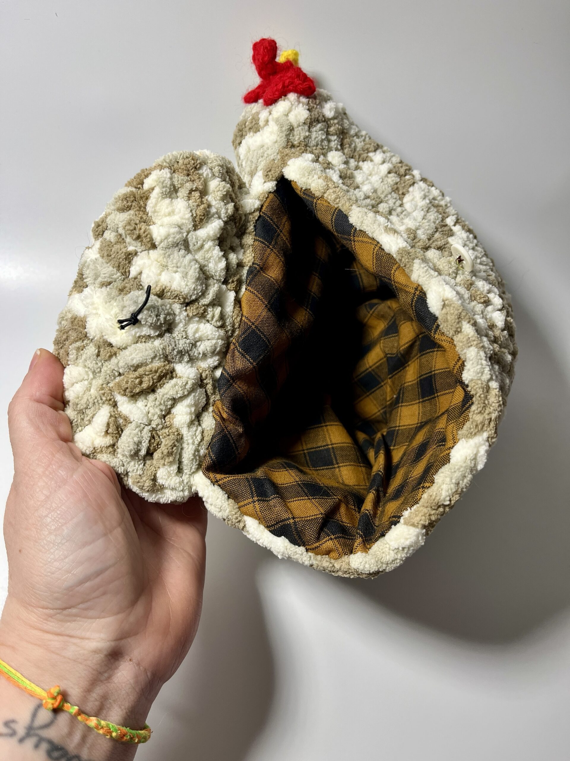 Mildred is a chicken and she can store your things inside! She is around six inches tall and eleven inches wide. Opening is around seven inches wide. Closure is elastic and a button.