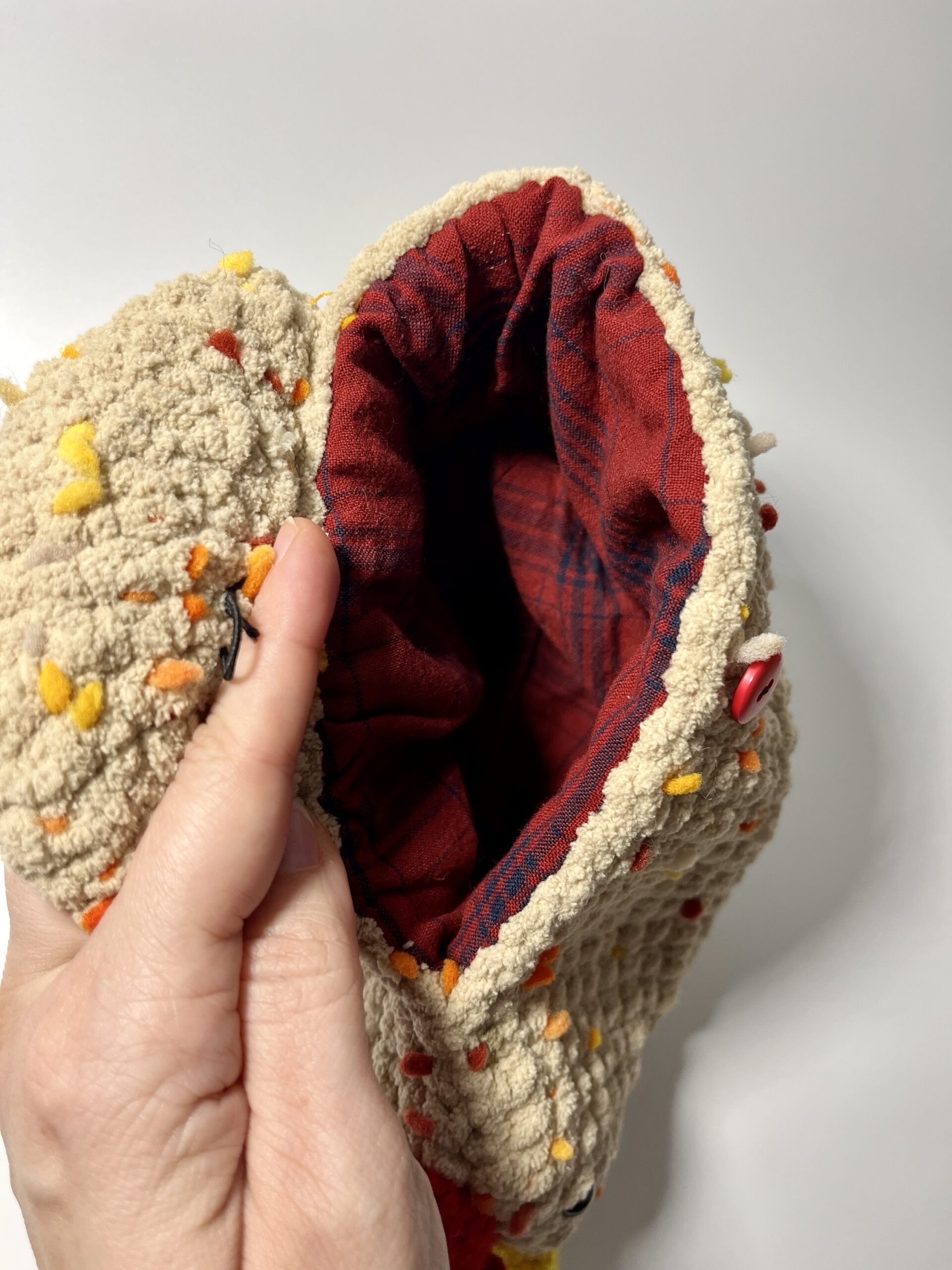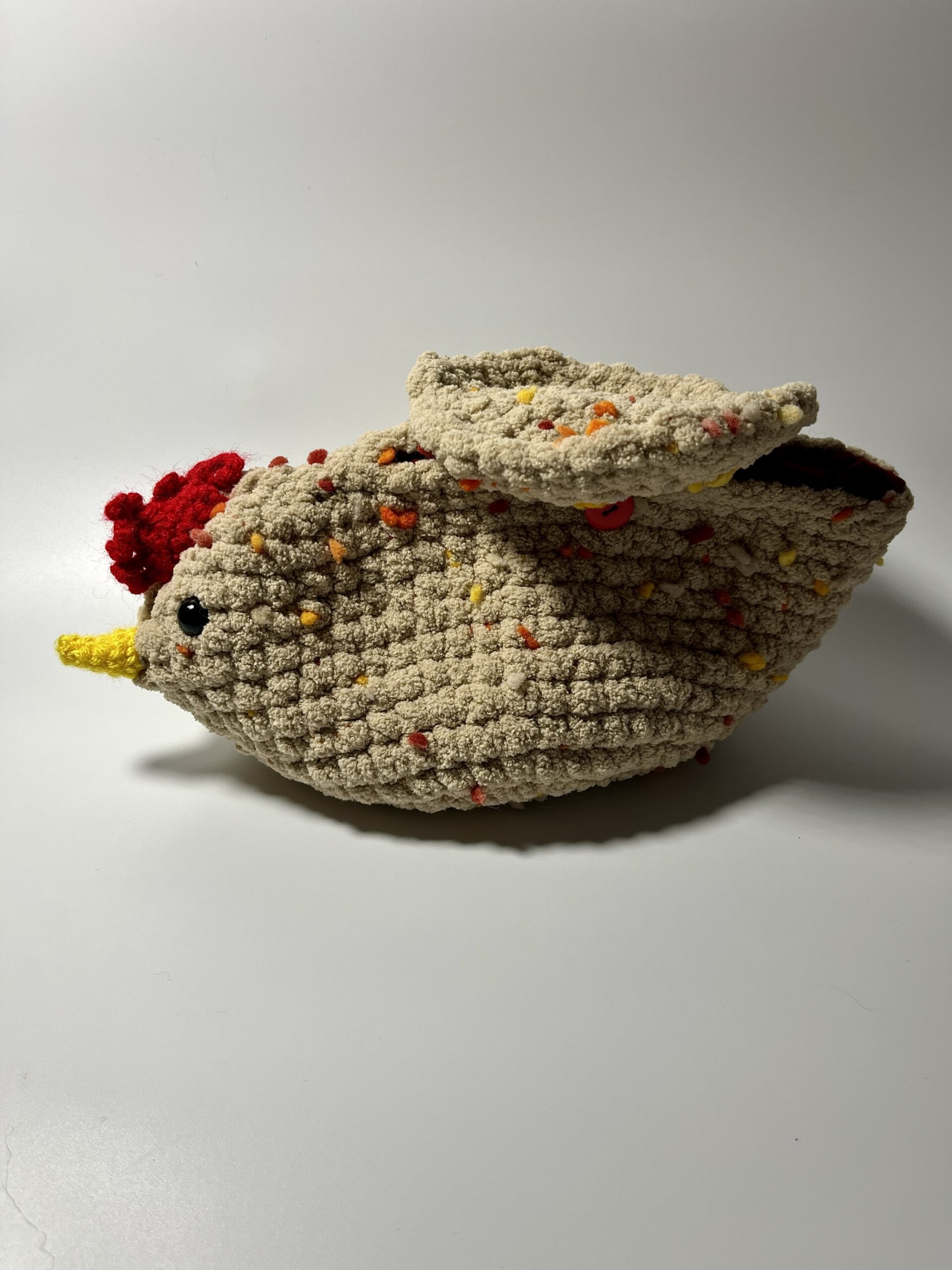 Tiny is a chicken and she can store your things inside! Tiny is around four inches tall and ten inches wide. Opening is around six inches wide. Closure is elastic and a button.