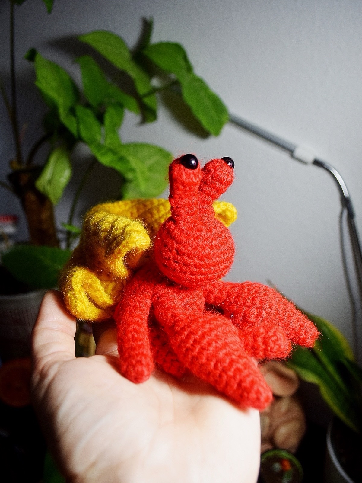 Herbie is around 5 inches tall and 7 inches long with shell. His crab rangoon shell is removable but when attached his tail holds it in place. Handmade by Carly with acrylic yarn. Our handmade plushes are not intended for children.